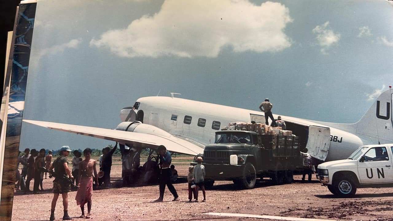 In the early 90s he agreed to a contract with the UN to feed troops in war-ravaged Cambodia, so needing to transport food and people around the Southeast Asian country, Morris bought ZK-BBJ and another DC-3, ZK-AMR. And on April 21, 1993, ZK-BBJ took her flight from New Zealand to Cambodia. In her days in Cambodia the old girl collected two bullets, one in the oil cooler and one in the wing tip, just missing the fuel tank.